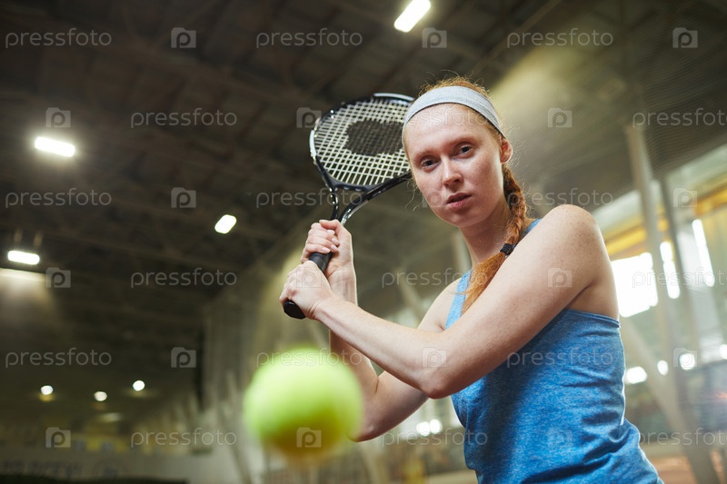 Портрет серьезной рыжеволосой женской теннисистки в спортивном головном повязке, сосредоточенном на движении мяча