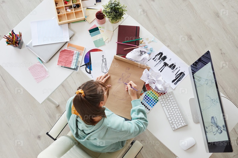 Высокоугольный вид молодой женщины в капюшоне, сидящей за столом с палитрами и компьютером и рисующей эскизы модной одежды в студии