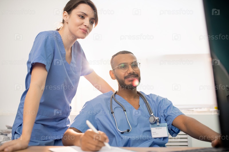 Успешные клиницисты смотрят на компьютерный экран, работая над новым проектом
