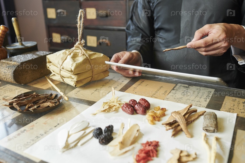 Практикующий китайскую медицину выбирает ингредиенты