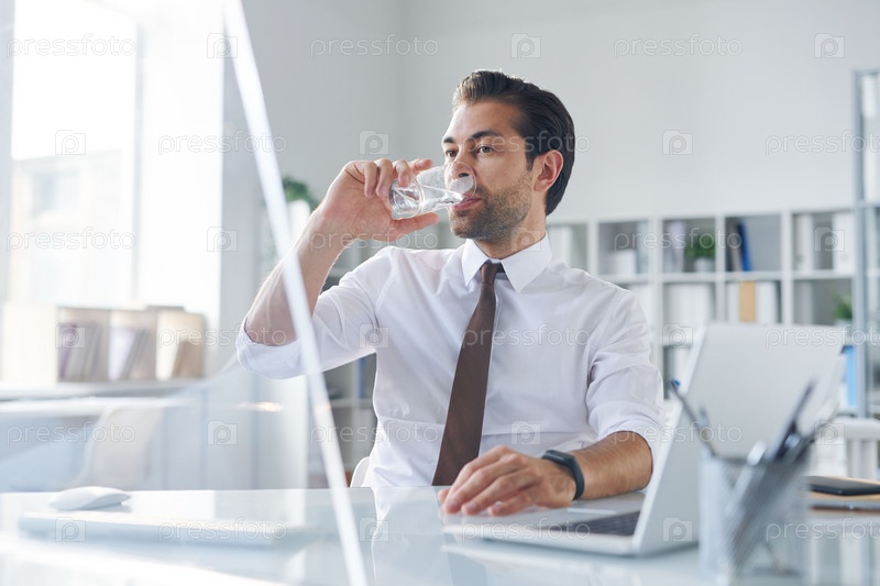 Жаждущий молодой брокер пьет стакан воды