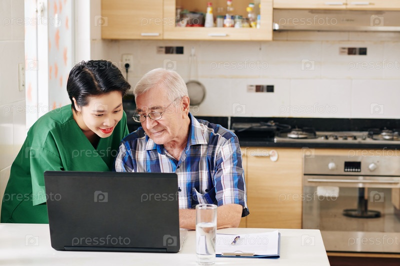 Доброволец показывает старшему человеку, как пользоваться ноутбуком