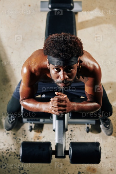 Без рубашки мускулистый мужчина, отдыхающий на скамейке