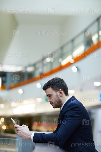 Серьезный сконцентрированный молодой человек в формальном костюме, опирающийся на перила и используя гаджеты, теряя время в аэропорту