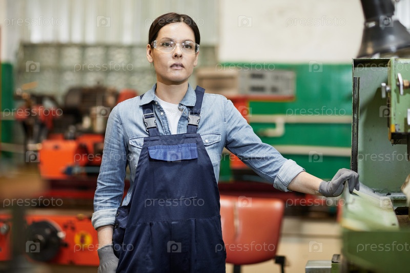Вдумчивая женская инженер-производитель в синих комбинезонах с защитными очками и перчатками, стоящая у фабричной машины