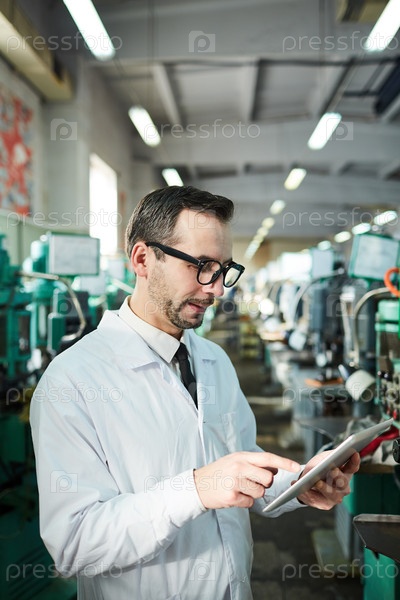Зрелый фабричный работник, держащий планшет