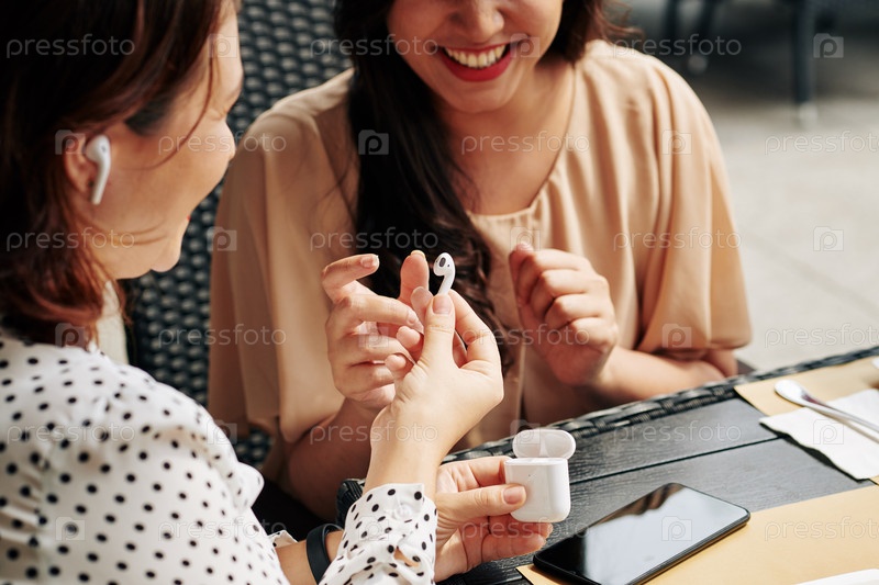 Женщина дает наушники своему другу