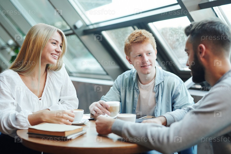 Группа счастливых случайных друзей из колледжа, сидящих за столом в кафе после занятий