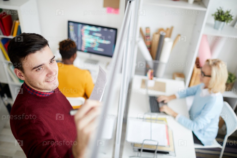 Позитивный красивый молодой творческий мужчина держит бумаги и пишет на стеклянной доске, разрабатывая стратегию