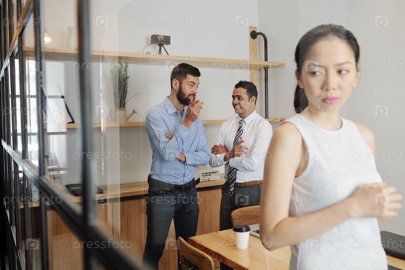 Деловая женщина слушает разговор двух бизнесменов
