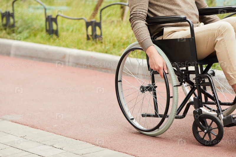 Близкий план неузнаваемого парня в повседневной одежде, сидящего в современной инвалидной коляске и вращающемся колесе кресла для движения на свежем воздухе