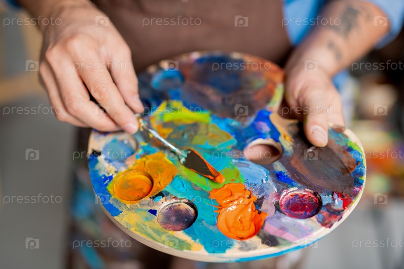 Рука художника смешивает краски на палитре с помощью небольшого инструмента, прежде чем рисовать