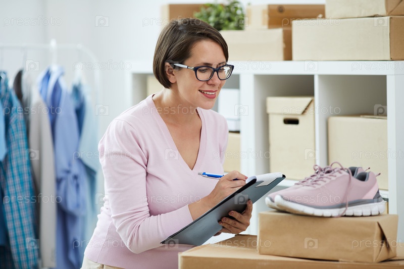 Молодая женщина записывает имя и номер новых розовых кроссовки