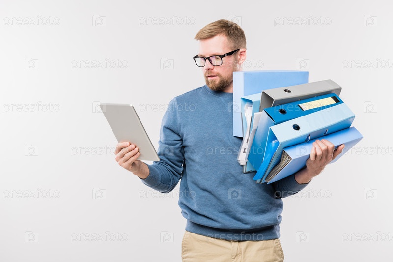 Загруженный офис-менеджер с цифровым планшетом и кучей папок, серфующих в сети