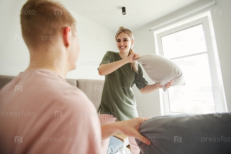 Счастливая молодая женщина с подушкой борется со своим мужем