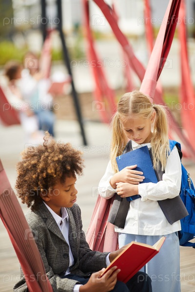 Одноклассники со своими книгами на улице