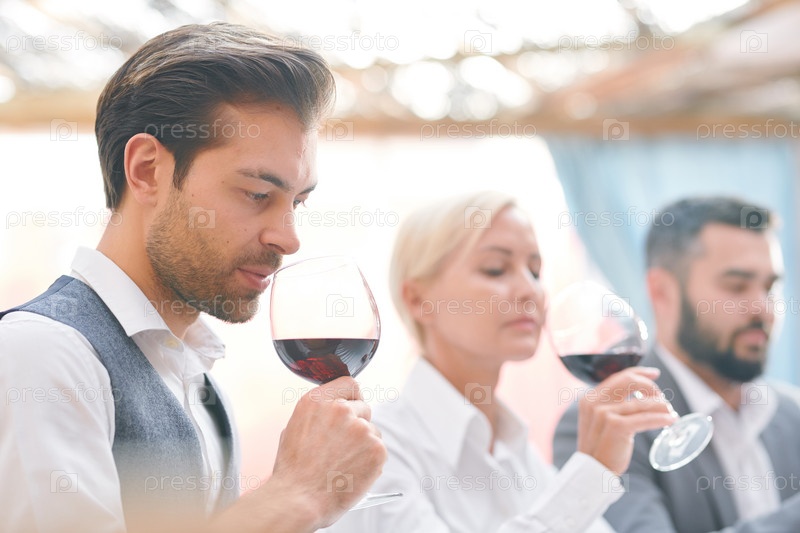 Серьезный мужской сомелье, нюхающий красное вино из винного стекла