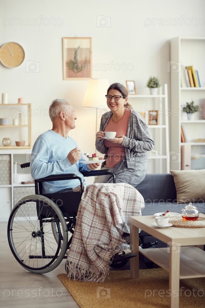 Веселая старшая женщина в очках пьет чай и смеется, рассказывая забавную историю мужу, который сидит на инвалидной коляске и ест торт