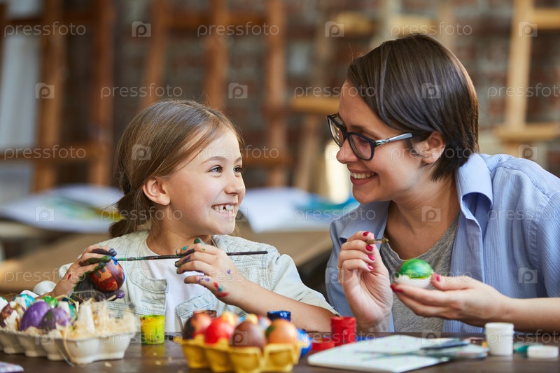 Маленькая девочка рисует пасхальные яйца с мамой