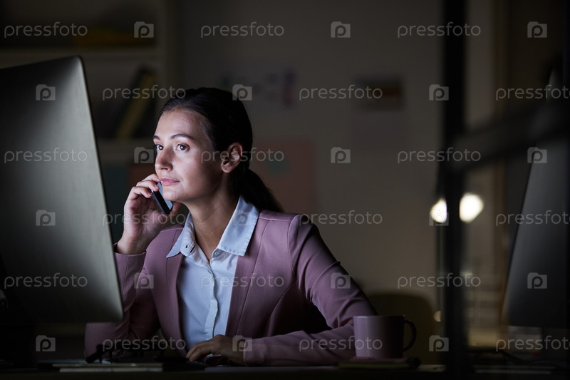 Деловая женщина разговаривает по телефону в темном офисе