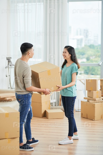 Пара с картонной коробкой дома