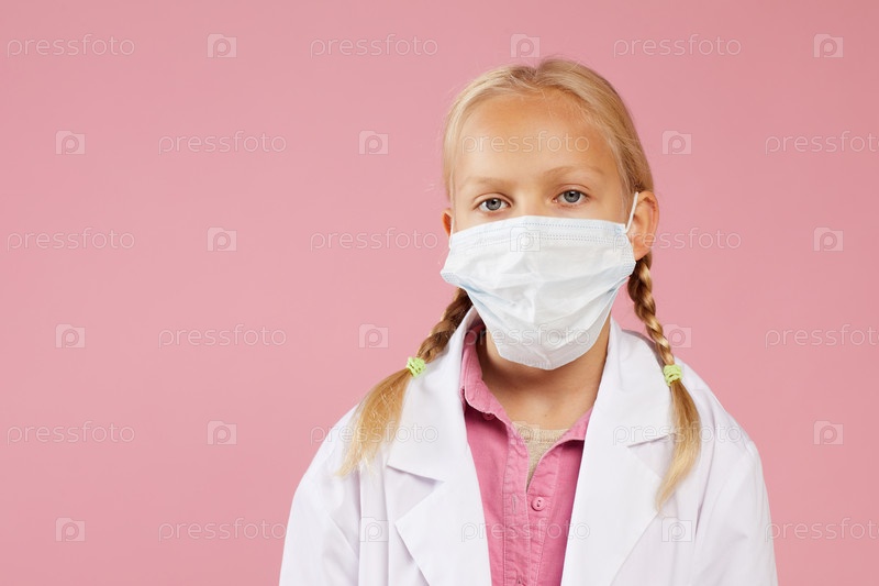 Портрет серьезного, недовольного маленького врача с сковородами в лабораторном пальто и защитной маске на розовом фоне