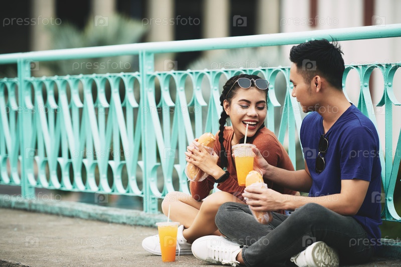 Молодая пара обедала в городе