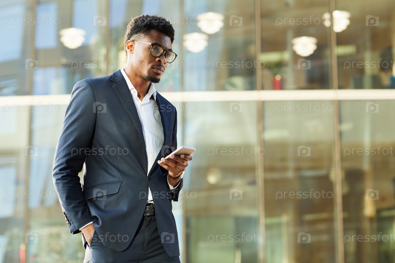 Серьезный, задумчивый хорошо одетый афроамериканский бизнесмен стоит напротив офисного здания и пользуется современным телефоном