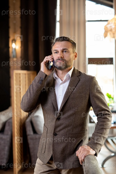 Серьезный агент с мобильным телефоном слушает своего клиента, стоя за столом