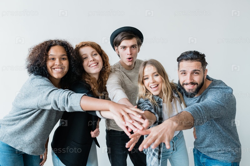 Молодые игривые межкультурные друзья в повседневной одежде смотрят на вас с улыбкой