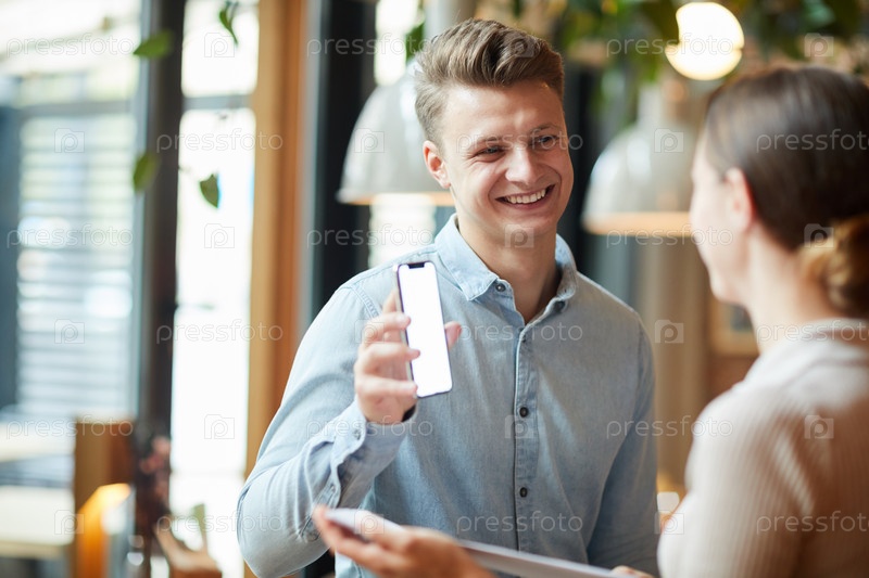Позитивный привлекательный молодой менеджер в непринужденной рубашке показывает удобное мобильное приложение коллеге, когда они обсуждают продвижение бизнеса