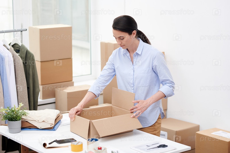 Менеджер интернет-магазина открывает пустую коробку перед упаковкой заказа