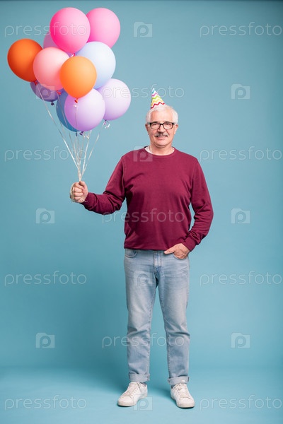 Счастливый зрелый мужчина в шапке на день рождения и повседневной одежде, держащий шарики