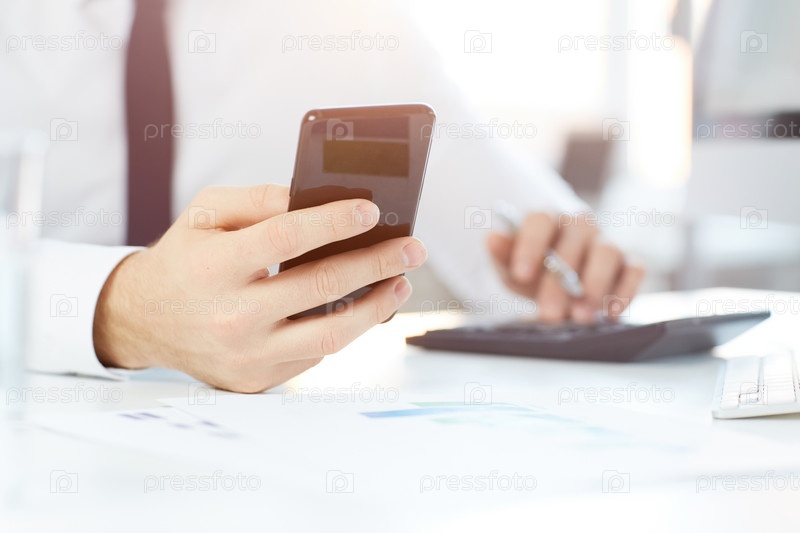 Близкий план неузнаваемого рабочего белого воротничка, сидящего за столом с бумагой и читающего уведомление в телефоне
