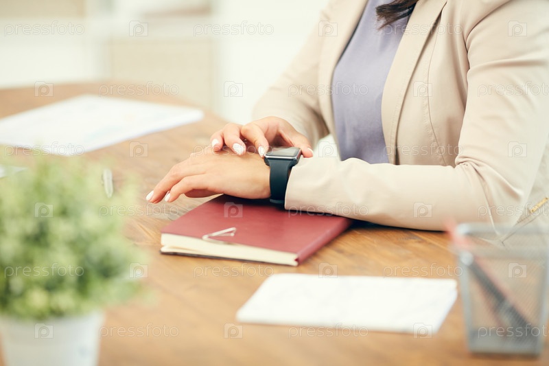 Деловая женщина проверяет умные часы Close Up