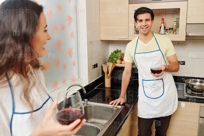 Счастливый мужчина в фартуке пьет вино