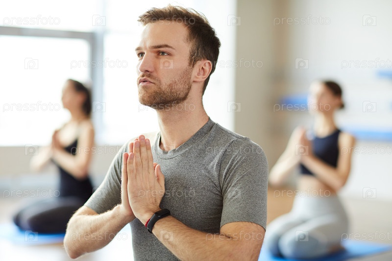 Мирный мужчина медитирует в йоге