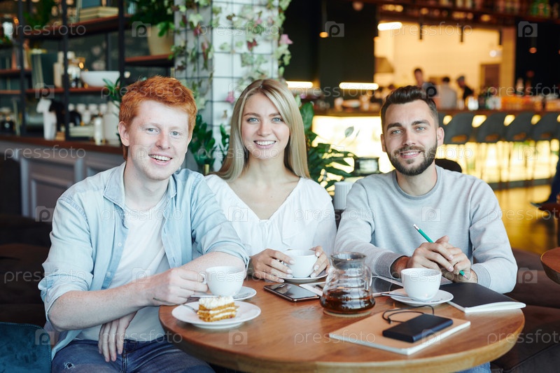 Группа веселых студентов, расслабляющихся в кафе после уроков и пьющих чай