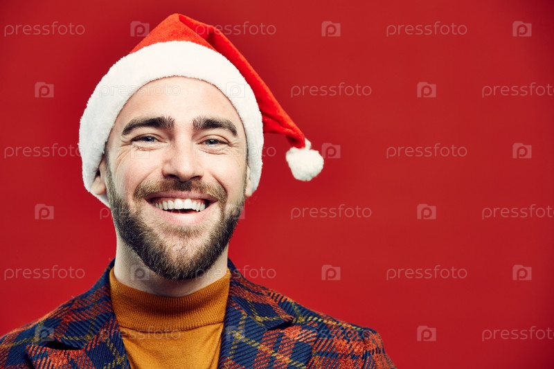 Улыбающийся взрослый мужчина, носящий Санта-Хэт на красном