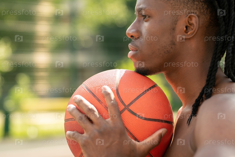 Боковой вид молодого мультикультурного спортсмена без рубашки с мячом