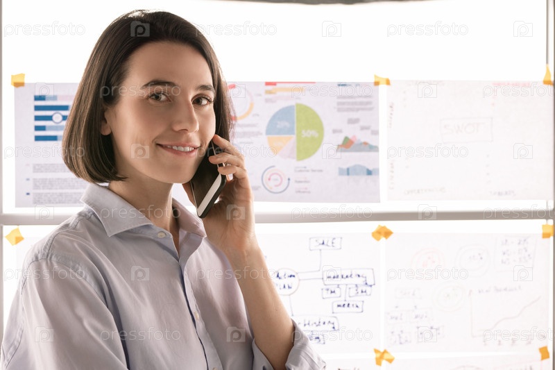 Улыбающийся молодой брокер со смартфонами консультирует клиентов перед камерой
