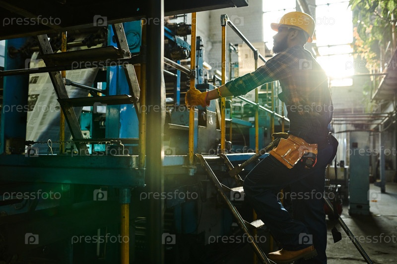 Серьезный красивый молодой рабочий с Ближнего Востока в жесткой шляпе, стоящий на лестнице и смотрящий на машину, он держит под контролем производственный процесс
