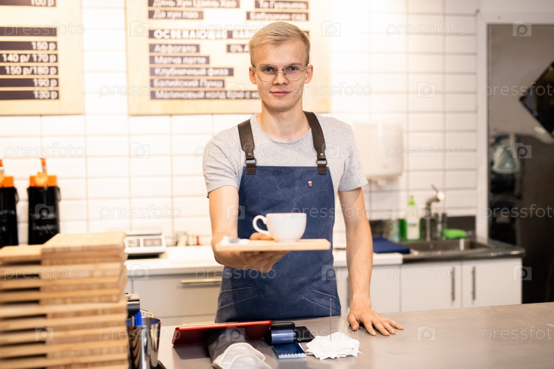 Молодой официант в очках и рабочей одежде дает тебе поднос с чашечкой кофе