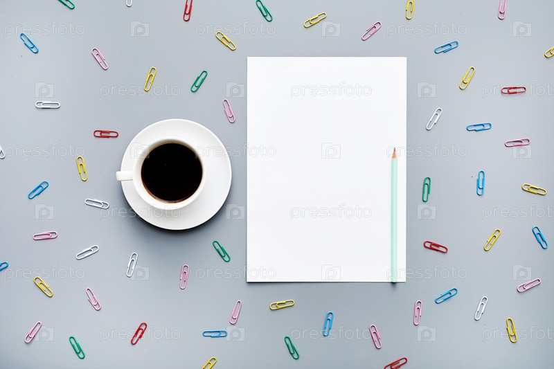 Непосредственно выше вид на творческое рабочее пространство с красочными зажимками, листом бумаги, карандашом и чашкой для кофе