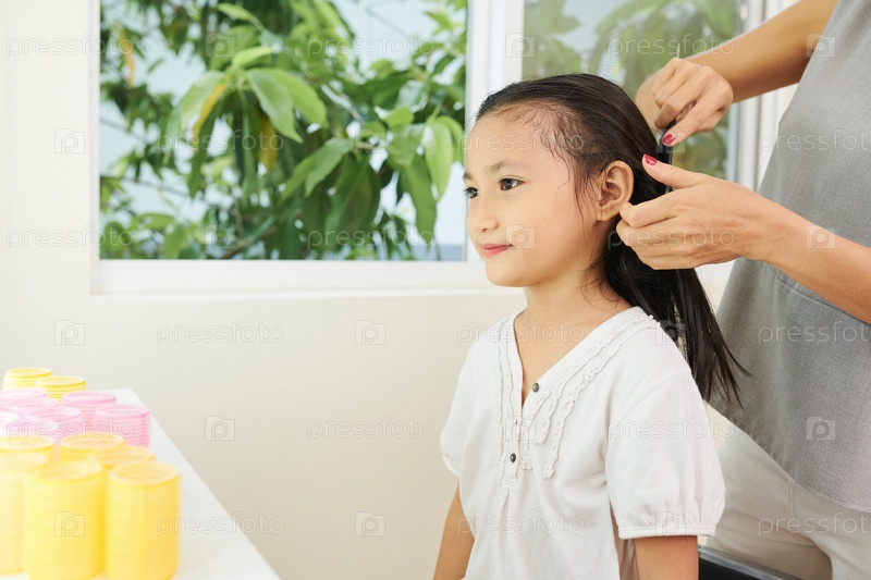 Маленькая девочка сидит в парикмахерском