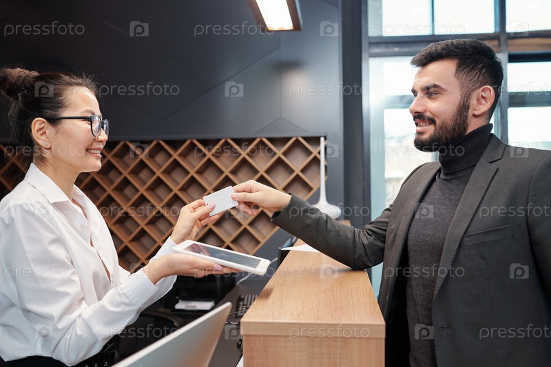 Молодой улыбающийся бизнес-путешественник принимает карту из гостиничного номера на стойке приема
