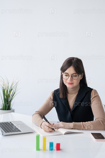 Молодая элегантная женщина-брокер смотрит на многоцветный кубический график на своем столе
