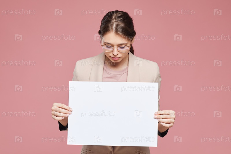 Серьезная умная молодая бизнес-леди в куртке стоит на розовом фоне и смотрит на пустой плакат, который держит она