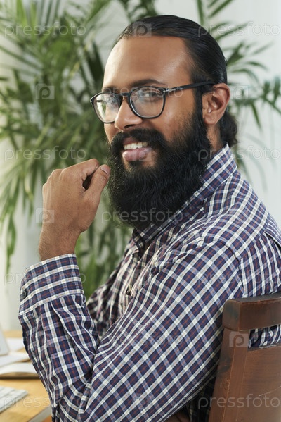 Бородатый улыбающийся мужчина сидит за столом