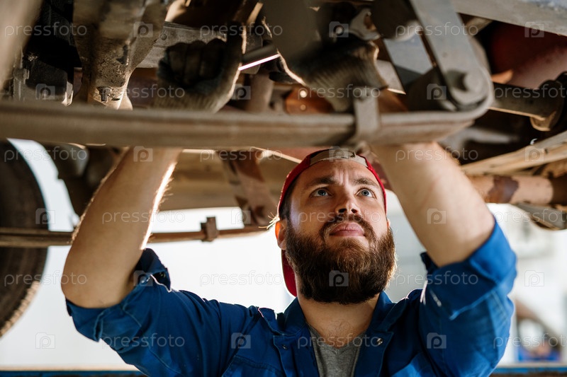 Бородатый работник технической службы, концентрирующийся на осмотре автомобильного двигателя